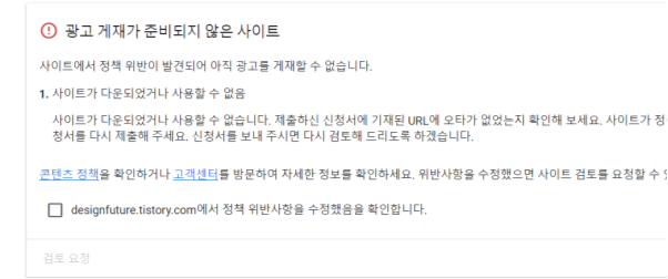 정책 위반이 발견되어 아직 게재할 수 없습니다. 사이트가 다운되었거나 사용할 수 없음...... 정책 위반이 문제인 겁니까? 사이트 다운이 문제인 겁니까? 정책 위반을 해서 다운되었다는 얘기일까요?? 제가 무슨 정책을 위반했을까요?
