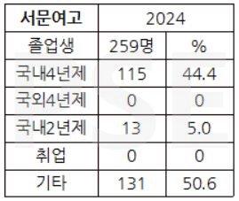 * 서문여고 2024 졸업생 259명 가운데 해외 대학 진학자는 없고 115명이 국내 4년제 대학에 진학하여 44.4%의 진학률을 보입니다. 전문대 진학자 13명 (5%)을 제외하고 졸업생의 50% 이상이 재수를 하는 상황입니다. 여타 여고에 비해 재수 비율이 높은 점은 유의할 만합니다.