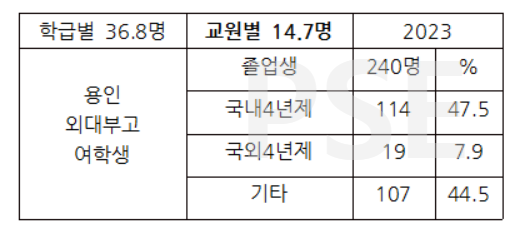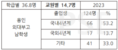 * 2023년 용인외대부고 여학생 졸업자 240명 가운데 19명이 국외 4년제 대학을 진학했습니다. 114명이 국내 4년제 대학에 진학하여 47.5%의 진학률을 보입니다. 쟁쟁한 입소문을 누리는 학교이지만 여학생 졸업자의 44.5%가 여전히 재수를 선택한다는 점은 유의해야 합니다.
