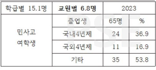 * 민사고 2023 여학생 졸업자 65명 가운데 11명(16.9%)이 국외 4년제 대학을 진학하였고, 24명(36.9%)이 국내 4년제 대학에 진학한 성과를 보입니다. 여타 특목고에 비해 여학생 진학률이 상대적으로 낮은 점은 주목할 만합니다.