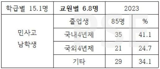 * 우선 민사고의 경우 교원별 학생 수가 과학영재학교 수준인 점이 눈길을 끕니다. 또한 여타 특목고와 달리 국외 해외 진학자가 졸업생 85명 가운데 국외 진학자가 21명으로 24.7%를 차지하는 점도 주목할 만합니다. 국내 4년제 대학 진학자는 35명으로 41.1%이고 기타 즉 재수생 비율이 34.1%입니다.