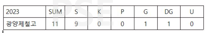* 같은 재단의 학교인데 진로 현황을 공개하는 포항제철고와 달리 광양제철고는 홍보 브로슈어에도 대학 진학 현황을 소개하지 않습니다. 어느 국회의원 공개 자료에 의하면, 광양제철고 2023 주요 6개 대학 진학 현황은 위와 같습니다. 물론 광양제철고의 재수율이 40% 수준인 점을 감안하여 2023 성과는 N수생이 포함된 입결임을 유의해야 합니다. 서울대 진학자는 9명이며 카이스트, 포스텍, 유니스트 진학자는 없습니다. 지스트와 디지스트 진학자가 각 1명씩입니다.