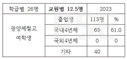* 포항제철고와 마찬가지로 광양제철고 졸업생의 경우에도 여타 전국 단위 모집 자사고와 달리 전문대 진학생이 존재합니다: 남학생 10명 여학생 4명 2023 전문대 진학