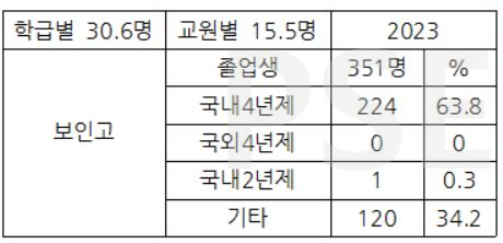 * 2023 보인고 졸업생 351명 가운데 해외 진학자는 없고 전문대 진학자가 1명 있습니다. 224명이 국내 4년제 대학에 진학하여 63.8%의 진학률을 보입니다.