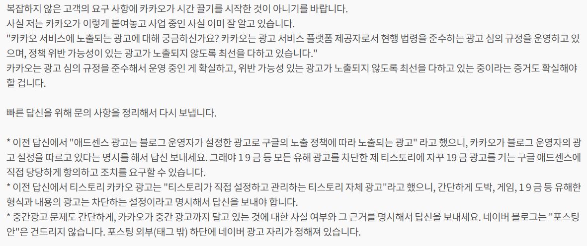 티스토리 1 9 금 광고 및 카카오의 중간 광고 여부에 관해 제가 반복해서 문의하고 있는 내용입니다. 카카오 답신의 요지는 없고 ㅎㅎ 시간 끌기 중입니다. 내용을 보시면 아시겠지만, 뭐 대단한 기업 비밀을 밝히라는 게 아니라, 간단한 사실 여부 확인입니다. 카카오가 시간 끌기하면 할수록 저는 그 자료들 한두 달 모은 후에 언론에 뿌릴 겁니다. 카카오와 티스토리 광고 관련 조사를 해봐야 한다고.