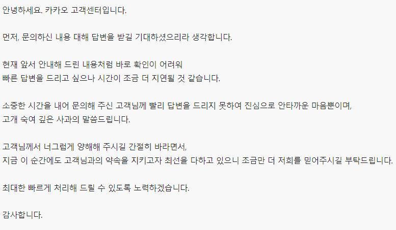 * 세번째 카카오 답신입니다. 시간 끌기입니다. 거 보라구요? 아뇨, 고객센터 상담원이 무슨 사실 확인 역량이 있습니까? 이 문제가 위로 전달되어야 하는 겁니다. 위에서 답이 올 때까지 상담원은 계속 반복적으로 이런 메시지를 보낼 수밖에 없습니다.