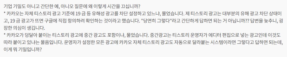 카카오는 고객들의 문의에 시간을 끌고 불분명하게 대응하면 티슷터들이 광고 관련 요구를 못할 거라고 생각하나요? 아니면 제풀에 꺽여서 문의 메일 그만둘 거라고 생각하는 걸까요?