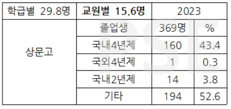 * 상문고 2023 졸업생 369명 가운데 해외 진학자는 1명(0.3%), 전문대 진학자는 14명(3.8%)입니다.