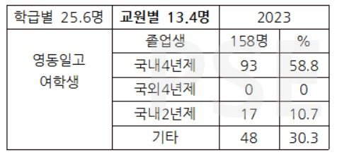 * 영동일고 2023 여학생 졸업자 158명 가운데 해외 진학자는 없고, 전문대 진학자는 17명으로 10.7%의 진학률을 보입니다. 남학생에 비해 여학생의 전문대 진학률이 크게 낮은 편입니다. 국내 4년제 대학 진학자는 93명으로 58.8%의 진학률을 보입니다. 남학생에 비해 훨씬 높은 대학 진학률을 보여주는 영동일고 여학생 졸업자의 입결입니다.