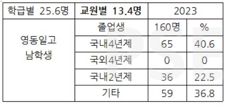 * 영동일고 2023 남학생 졸업자 160명 가운데 해외 진학자는 없고 전문대 진학자는 36명으로 22.5%라는 꽤 높은 전문대 진학률을 보입니다. 국내 4년제 대학 진학자는 65명으로 40.6%의 진학률을 보입니다.