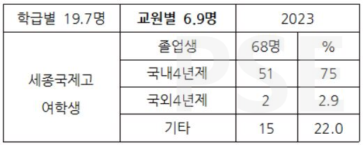 * 세종국제고 2023 여학생 졸업자 68명 가운데 해외 대학 진학자는 2명(2.9%)이며 국내 4년제 대학 진학자는 68명으로 75%의 진학률을 보입니다. 여학생 졸업자의 22% 이상이 재수하는 상황입니다.