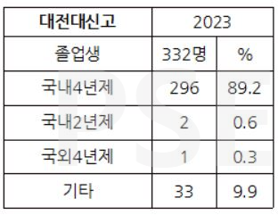 * 대전대신고 2023 졸업생 332명 가운데 국외 4년제 대학 진학자는 1명(0.3%), 전문대 진학자는 2명(0.6%)입니다. 국내 4년제 대학 진학자는 296명으로 89.2%의 높은 진학률을 보입니다. 대전 광역단위 모집 자사고는 진학률이 여타 지역 자사고에 비해 매우 높습니다.