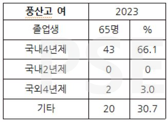 * 풍산고 2023 졸업 여학생 65명 가운데 전문대 진학자는 없고 국외 4년제 대학 진학자가 두 명(3%), 국내 4년제 대학 진학자는 43명으로 66% 이상의 진학률을 보입니다. 여학생 졸업자의 30% 이상이 재수를 하는 상황입니다. 여학생 진학률이 상대적으로 낮은 점을 유의해야 합니다.