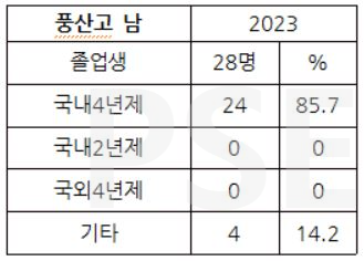 * 풍산고 2023 졸업 남학생 28명 가운데 전문대 진학자나 해외 대학 진학자는 없는 24명이 국내 4년제 대학에 진학하여 85.7%의 진학률을 보입니다. 남학생 졸업자의 14% 이상이 재수를 하는 상황입니다.