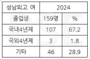 * 성남외고 2024 여학생 졸업자 159명 가운데 국외 4년제 대학 진학자는 3명( 1.8%), 국내 4년제 대학 진학자는 107명 (67.2%)으로 졸업생의 28% 이상이 재수를 하는 상황입니다. 성남외고의 경우 남녀 학생 모두 재수 비율이 낮은 점이 눈길을 끕니다.