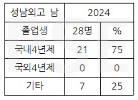 * 성남외고 2024 남학생 졸업자 28명 가운데 21명이 국내 4년제 대학에 진학하여 75%의 진학률을 보입니다. 국외 대학 진학이나 전문대 진학 등이 없기 때문에 졸업생의 25%가 재수를 하는 상황입니다. 여타 외고에 비해 상대적으로 낮은 재수 비율입니다.