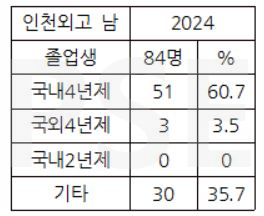 * 인천외고 2024 남학생 졸업자 84명 가운데 국외 4년제 대학 진학자는 3명(3.5%), 국내 4년제 대학 진학자는 51명으로 60% 이상의 진학률을 보입니다. 남학생 졸업자의 35% 이상이 재수를 하는 상황입니다.