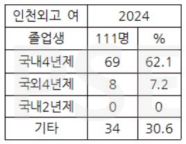 * 인천외고 2024 여학생 졸업자 111명 가운데 국외 4년제 대학 진학자는 8명(7.2%), 국내 4년제 대학 진학자는 69명 (62.1%)이며 여학생 졸업자의 30% 이상이 재수를 하는 상황입니다. 인천의 특수한 교육 환경 덕분인지 여타 외고에 비해 국외 대학 진학자가 상대적으로 많은 점이 눈길을 끕니다.