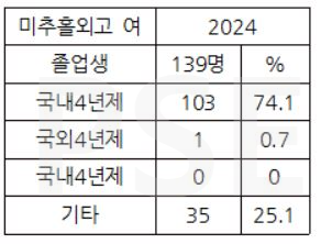 * 미추홀외고 2024 여학생 졸업자 139명 가운데 국외 4년제 대학 진학자는 1명(0.7%), 국내 4년제 대학 진학자는 103명으로 74.1%의 진학률을 보입니다. 남녀 학생 진학률이 큰 차이를 보이는 점은 주의해야 합니다. 여학생 졸업자의 25% 이상이 재수를 하는 상황입니다.