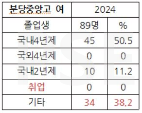 * 분당중앙고 2024 여학생 졸업자 89명 가운데 해외 대학 진학자는 없습니다. 전문대 진학자는 10명 (11.2%)으로 비율이 좀 높은 편임을 유의해야 합니다. 45명이 국내 4년제 대학을 진학하여 50.5%의 진학률을 보입니다. 학교알리미 여학생 통계 역시 34명으로 표기된 취업자 수를 기타로 조정하여 정리했습니다.