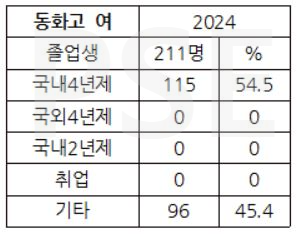 * 동화고 2024 여학생 졸업자 211명 가운데 115명이 국내 4년제 대학에 진학하여 54.5%의 진학률을 보입니다. 남녀 학생의 진학률 차이가 눈길을 끕니다. 동화고는 여학생의 경우도 여타 진로 현황은 전혀 없는 진학 통계입니다.