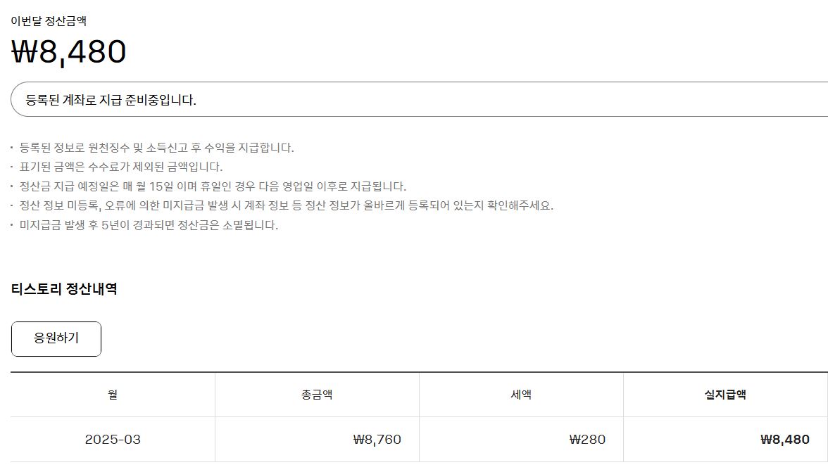 | 응원받기 정산금 입금이 기쁘지 않습니다 (221) | 2025.04.16 |
