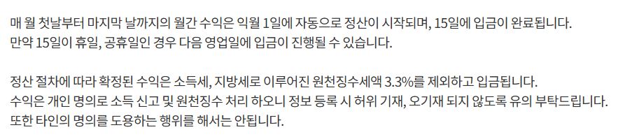 * 그런데 시력 나쁜 제가 이렇게 큰 글씨들은 놓쳤나 봅니다. 수익 정산 내역 위에 이렇게 큰 글씨들로 설명들이 나열되었고, "표기된 금액은 수수료가 제외된 금액"이라고 쓰인 게 보입니다. ㅎ일주일 전에 있었는지 여부는 기억 안 납니다. 근데 왜 결제 수수료라고 안 쓰고 "수수료"라고 또 궁금증을 자아내게 썼을까요? 더 욕먹을 것 같은데요? 혹시 결제 수수료만이 아니라 지들이 수수료를 떼는 게 아닐까요?