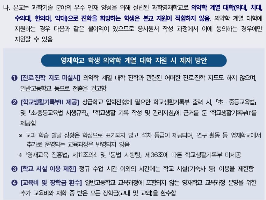도대체 이 문제를 왜 못 잡나 싶었는데, 아래 조항들을 보고 실소를 멈출 수 없었습니다. 기숙사 사용 제한? 참 귀엽습니다. 제재 방안이 너무 미약합니다. 교육부와 서울과고, 제정신인가 싶습니다. 과고 출신 의약계열 진학자들은 예비 과학자들을 방해하는 사기범들입니다. 교육비 환수 수준이 아니라 징벌적 손해 배상을 청구하는 것은 물론 학적을 주지 말아야 합니다. 의과학자, 약학 분야 과학자가 되고 싶다고 우기는 변명까지 제도적으로 차단해야 합니다: 개인적으로 영재학교 및 과고 졸업자는 의약 관련 전공의 경우 영구적으로 지원 불가해야 한다고 봅니다. 전학 및 자퇴 시기도 1학년 1학기로 한정하고 그 이후에는 강제 출교시켜야(즉, 학적 주지 말아야) 한다고 봅니다. 이 정도 강력해야 의약 전공 희망자들의 과고 지원 자체가 줄고, 예비 과학자들도 추가 입학 가능하다고 봅니다.