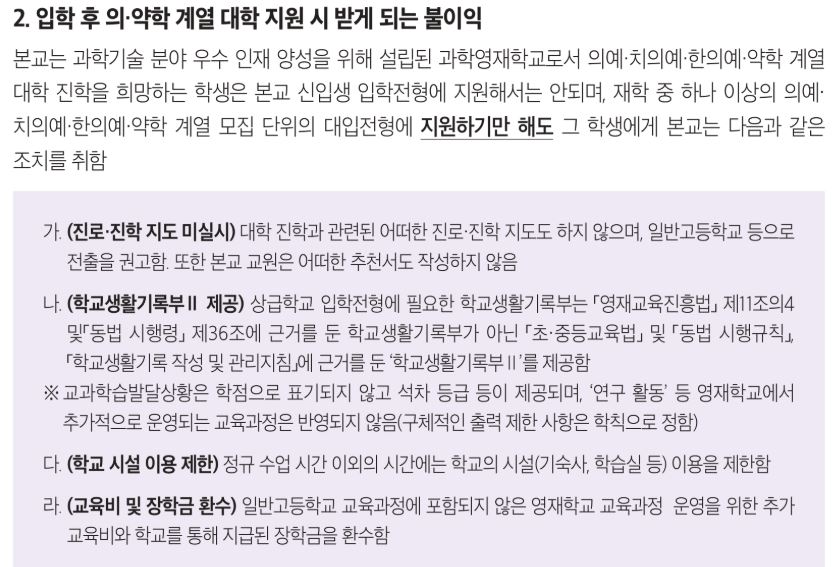 * 경기과고는 서울과고에 비해 보다 엄격한 용어인 "하여서는 안 된다"를 사용하고 있지만, 뭐 실제 조치는 동일합니다. 이러니 이 문제가 해결이 되겠습니까? 반복하지만 과고 출신의 의약계열 진학은 예비 과학자 육성을 고의로 방해하는 사기이자 업무 방해 행위입니다. 교육비 환수 수준이 아니라 징벌적 손해 배상을 청구하는 것은 물론 학적을 주지 말아야 합니다. 미성년자에게 실행불가하다고요? 입학 시 학생은 물론 부모의 서약서를 받아야합니다: 의약학을 지원하게 될 경우 법적 책임을 진다.