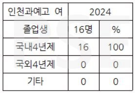 * 인천과예고 2024 여학생 졸업자 16명은 모두 국내 4년제 대학에 진학하여 100%의 진학률을 보입니다. 물론 "반수" "재수" 등이 발생할 가능성이 있지만 그래도 매우 놀랍고도 이상적인 진학 현황입니다.