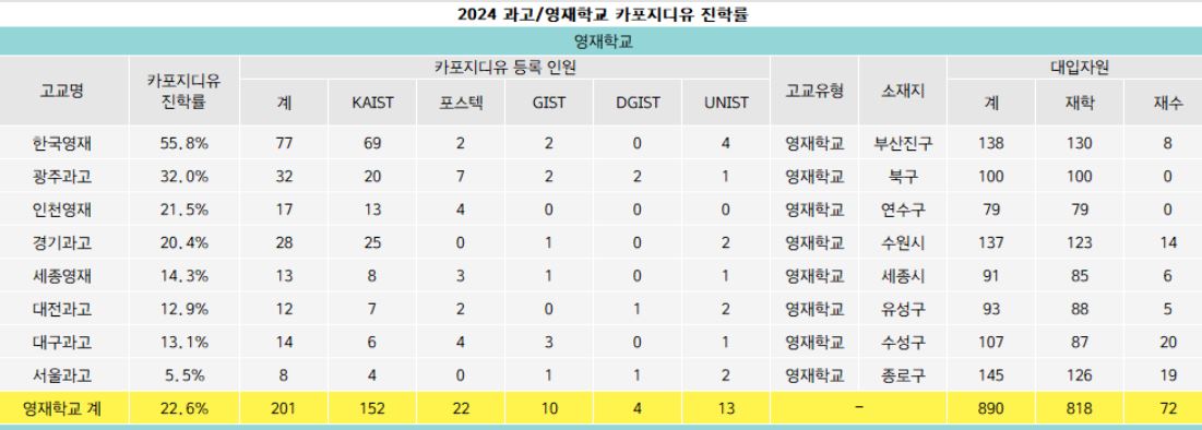 * 인천과예고 졸업자 가운데 2024 이공계특성화대학에 진학한 학생은 17명입니다. 경기과고와 비슷하게 졸업생의 20% 정도가 소위 카포지디유 진학자 비율인 상황입니다. 영재학교의 경우 진학자의 소양과 진로 방향을 보다 정확하게 파악하는 것도 중요하고, 교육 과정에서도 방향성을 명확히 지도하는 것도 매우 중요하다고 생각됩니다.