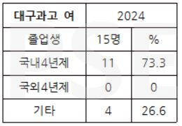 * 대구과고 2024 여학생 졸업자 15명 가운데 해외대학 진학자는 없고 11명이 국내 4년제 대학에 진학하여 73.3%의 진학률을 보입니다. 여학생 역시 여타 과고에 비해 상대적으로 진학률이 낮은 편입니다.