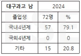 * 대구과고 2024 남학생 졸업자 72명 가운데 해외 대학 진학자는 없고 57명이 국내 4년제 대학에 진학하여 79.1%의 진학률을 보입니다. 여타 영재학교에 비해 낮은 진학률이 눈길을 끕니다.