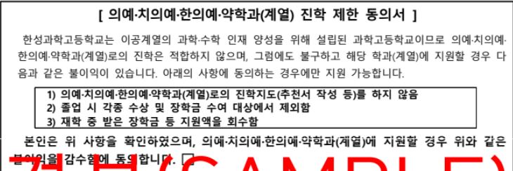 한성과고의 경우 공통 제출 서류 가운데 아래와 같은 동의서가 포함됩니다. 하지만 크게 눈에 띄는 조치는 없고 여타 과고와 마찬가지로 "불이익"을 감수하는데 동의한다 수준의 동의서입니다.