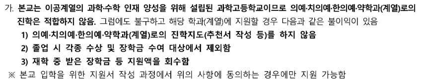 의약계열 진학 제한 관련 한성과고의 지침과 조치 역시 여타 과고가 소개하는 수준의 일반적인 "불이익" 타령입니다. 반복하지만 불이익은 "의약계열" 진학 희망자 때문에 과학 계열 진학 희망자가 받고 있는데, 불이익이라는 단어를 여기에 쓰고 있다는 사실 자체가 지금 이 문제를 오독하고 호도하고 있는 교육부가 해결 능력도 의지도 없다는 현실을 드러낸다고 봅니다.