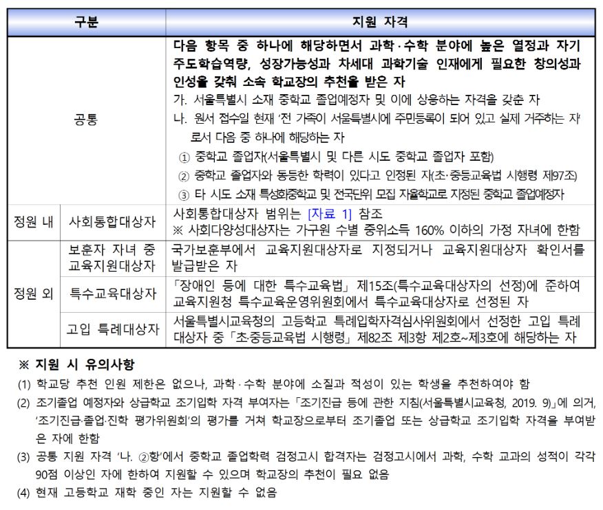 세종과고뿐만 아니라 여타 과학고등학교 지원 자격은 (지역 조건을 제외하고) 대동소이합니다. 아래를 참고하세요.