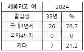* 세종과고 2024 여학생 졸업자 33명 가운데 해외 대학 진학자는 없고 26명이 국내 4년제 대학에 진학하여 78.7%의 진학률을 보입니다. 전체적으로 서울과고와 한성과고에 비해 진학률이 낮은 점이 눈길을 끕니다.