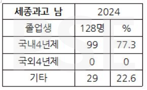 * 세종과고 2024 남학생 졸업자 128명 가운데 해외 대학 진학자는 없고 99명이 국내 4년제 대학에 진학하여 77.3%의 진학률을 보입니다.