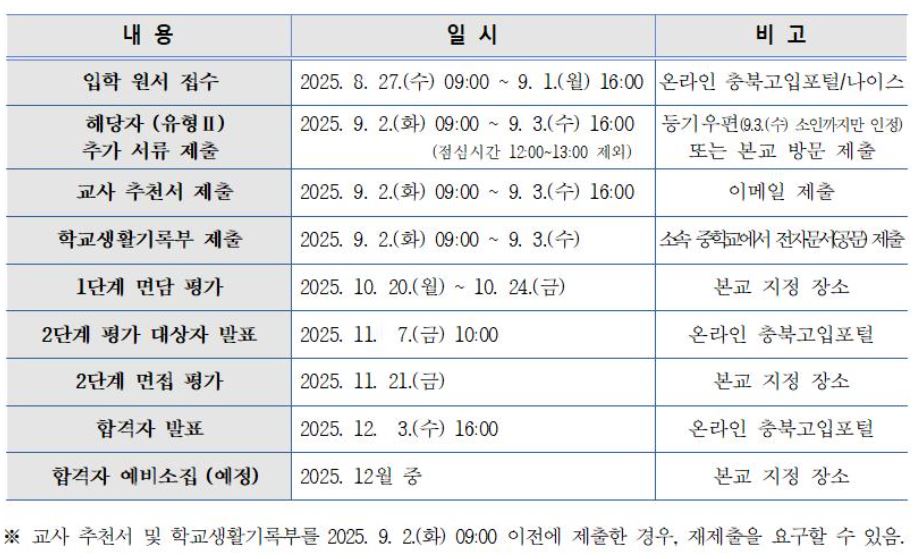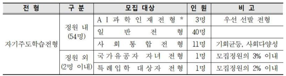 * 충북과고 정원 내 일반전형의 경우 세종시 소재 중학교 학생 선발 인원은 5명 이내로 제한된 점 유의해야 합니다. 또한 충북과고의 경우 여타 과고와 다른 AI과학인재 전형이 눈길을 끕니다. AI과학인재 전형은 과학 수학 이외에 정보 역량 갖춘 인재를 우선 선발하는 전형인데, 적합자가 없는 경우 일반 또는 사회통합 전형 대상자로 전환한다고 합니다.