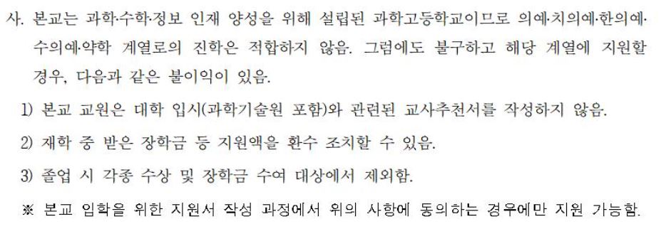 * 충북과고의 경우 의약계열 진학 제한 동의서가 입학원서 자료에 포함되어 있습니다. 그래도 의약계열 진학 제재 관련 기본 지침은 여전히 여느 과고와 유사한 "불이익" 타령입니다. 반복하지만 불이익은 "의약계열" 진학 희망자 때문에 과학 계열 진학 희망자가 받고 있는데, 불이익이라는 단어를 여기에 쓰고 있다는 사실 자체가 지금 이 문제를 오독하고 호도하고 있는 교육부가 해결 능력도 의지도 없다는 현실을 드러낸다고 봅니다. 과고 출신의 의약계열 진학은 불이익과 제재 처리가 아니라, "금지" 조치가 기본이 되어야 합니다.