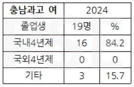 * 충남과고 2024 여학생 졸업자 19명 가운데 해외 대학 진학자는 없고 16명이 국내 4년제 대학에 진학하여 84% 수준의 진학률을 보입니다.