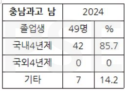 * 보통 지역 소재 과학고의 진학률이 수도권이나 광역시 소재 과학고의 진학률보다 높은 입결을 보이는데 충남과고의 경우는 조금 다르다는 점이 우선 눈길을 끕니다. 충남과고 2024 남학생 졸업자 49명 가운데 해외 대학 진학자는 없고 42명이 국내 4년제 대학에 진학하여 85% 수준의 진학률을 보입니다. 학생 수가 적어서 비율 변동이 크게 보이기도 하지만, 어쨌든 지역 소재 과고는 대개 90% 이상의 진학률을 보이기 때문에 조금 놀랍습니다.
