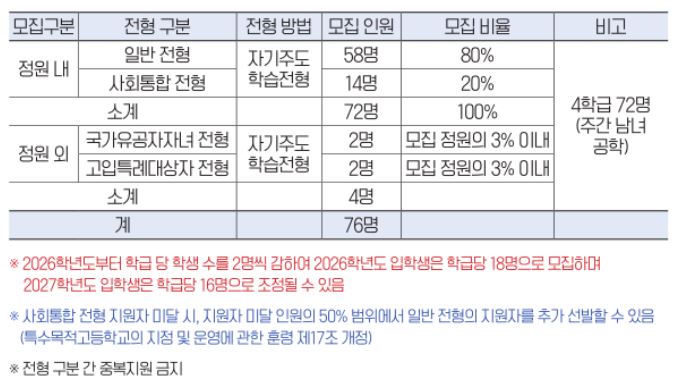 * 전남과고의 경우 2026학년도부터 학급당 학생 수를 2명씩 줄여서 전체 모집 정원이 80명에서 72명으로 감소한 점을 유의해야 합니다. 정원 외 모집 학생 수는 4명을 그대로 유지하고 있습니다.