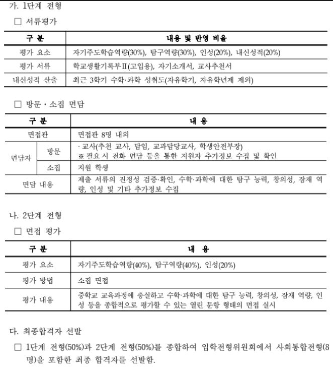 제주과고도 여타 과고와 마찬가지로 서류 및 면접 단계를 통해 신입생을 선발합니다. 다만 여타 과고와 달리 꽤 상세한 전형 관련 설명을 제공하고 있습니다. 칭찬합니다.