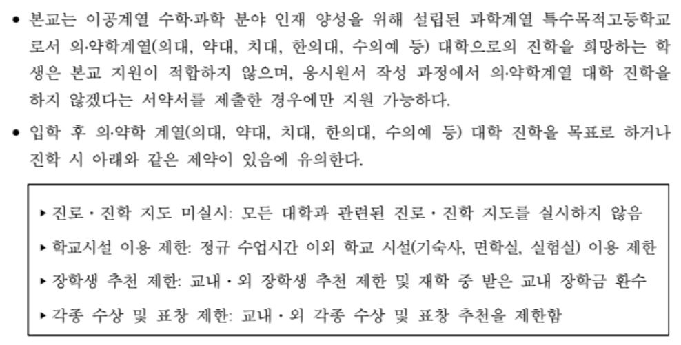 * 의약계열 진학과 관련하여 제주과고는 여타 과고와는 다른 용어를 사용합니다. 일단 여타 과고의 '불이익' 타령은 없고 "의약계열 진학을 제약"한다는 표현으로 의약계열 진학에 관한 보다 강력한 의지를 표명합니다. 또한 의약계열 대학을 진학하지 않겠다는 서약서를 제출해야만 지원이 가능하다는 점도 천명하고 있습니다. "금지"까지는 아니라도 여타 과고에 비해 보다 분명한 "제재"조치를 갖춘 점은 칭찬합니다.