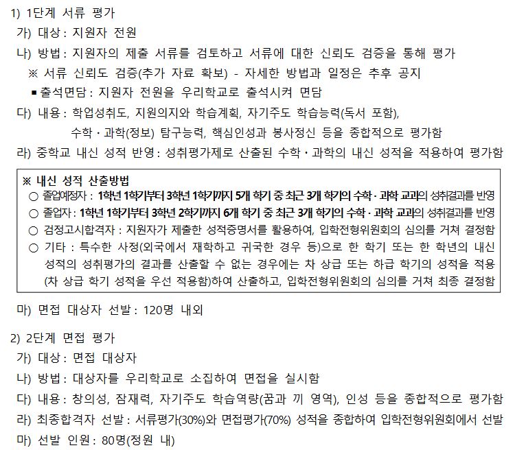 * 대구일과고 역시 여전히 여느 과고와 유사한 "불이익" 타령에 '동의하는 경우에만 지원 가능'을 반복하고 있습니다. 한국 과학고들은 왜 이렇게 하나같이 수동적인 모습을 보이는지 모르겠습니다. 그나마 학생은 물론 학부모의 동의서라도 요구하는 소수 학교를 제외하고, 대다수 과학고는 이런 안이한 정책을 정책이라고 내세우고 있습니다. 의도적이라고 의심됩니다. 사실 학생들은 동의했으므로 입학은 강행하고 장학금, 진학 상담 등 과고의 "기타" 서비스는 안 받겠다고 우기면 그만일 듯합니다.