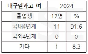 * 대구일과고 2024 여학생 졸업자 12명 가운데 해외대학 진학자는 없고 1명을 제외한 11명 모두 국내 4년제 대학을 진학하여 91% 이상의 높은 진학률을 보입니다.