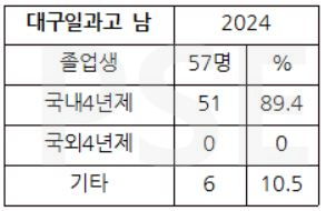 * 대구일과고 2024 남학생 졸업자 57명 가운데 해외대학 진학자는 없고 51명이 국내 4년제 대학에 진학하여 89% 이상의 진학률을 보입니다.