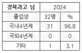 * 경북과고 2024 졸업생 38명 가운데 32명은 남학생, 6명은 여학생으로 남녀 학생 비율이 여타 과고와 비슷한 수준입니다. 경북과고 2024 남학생 졸업자 32명 가운데 해외 대학 진학자는 없고 1명을 제외한 31명 모두 국내 4년제 대학에 진학하여 96% 이상의 진학률을 보입니다.