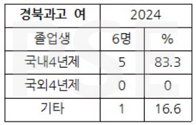 * 경북과고 2024 여학생 졸업자 6명 가운데 해외대학 진학자는 없고 1명을 제외한 5명 모두 국내 4년제 대학에 진학하여 83% 이상의 진학률을 보입니다. 학생 수가 적다 보니 퍼센트 수치가 낮게 느껴지는 점 유의해서 참고해야 합니다.